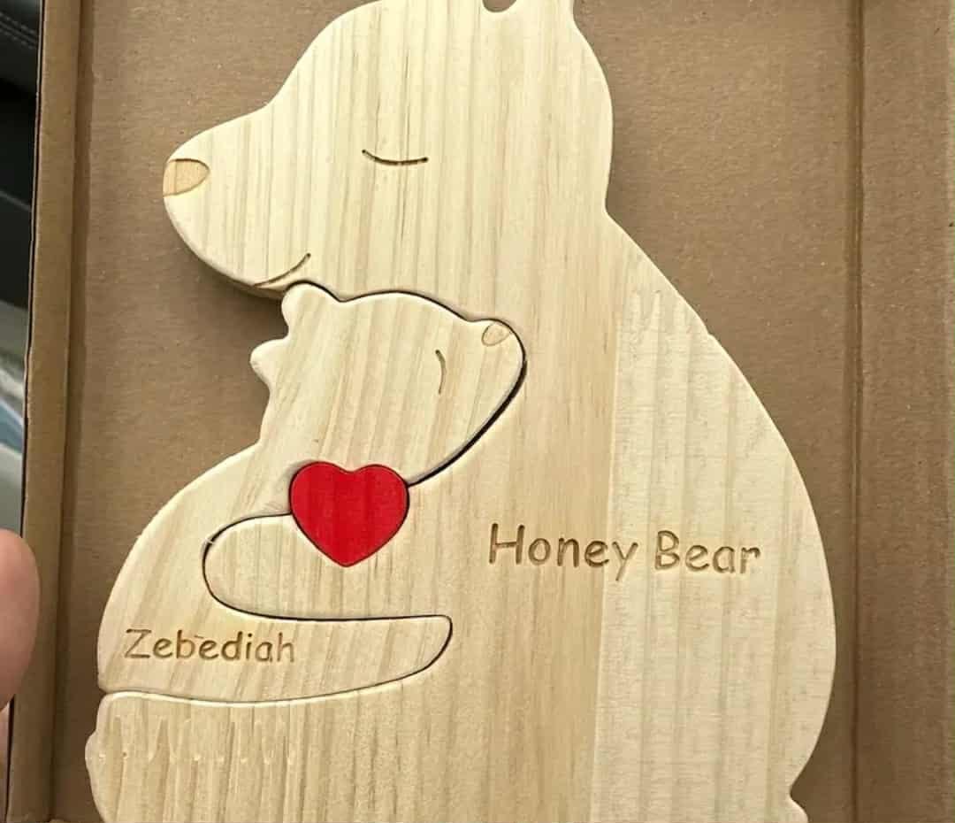 Esta encantadora familia de osos personalizada es un conmovedor símbolo de amor, unión y cercanía. Cada pieza de oso de madera está cuidadosamente elaborada a mano con madera natural de alta calidad, lo que hace que cada conjunto sea verdaderamente único. La textura suave, el grabado detallado y los nombres personalizados la convierten en un recuerdo que celebra el vínculo especial de tu familia.