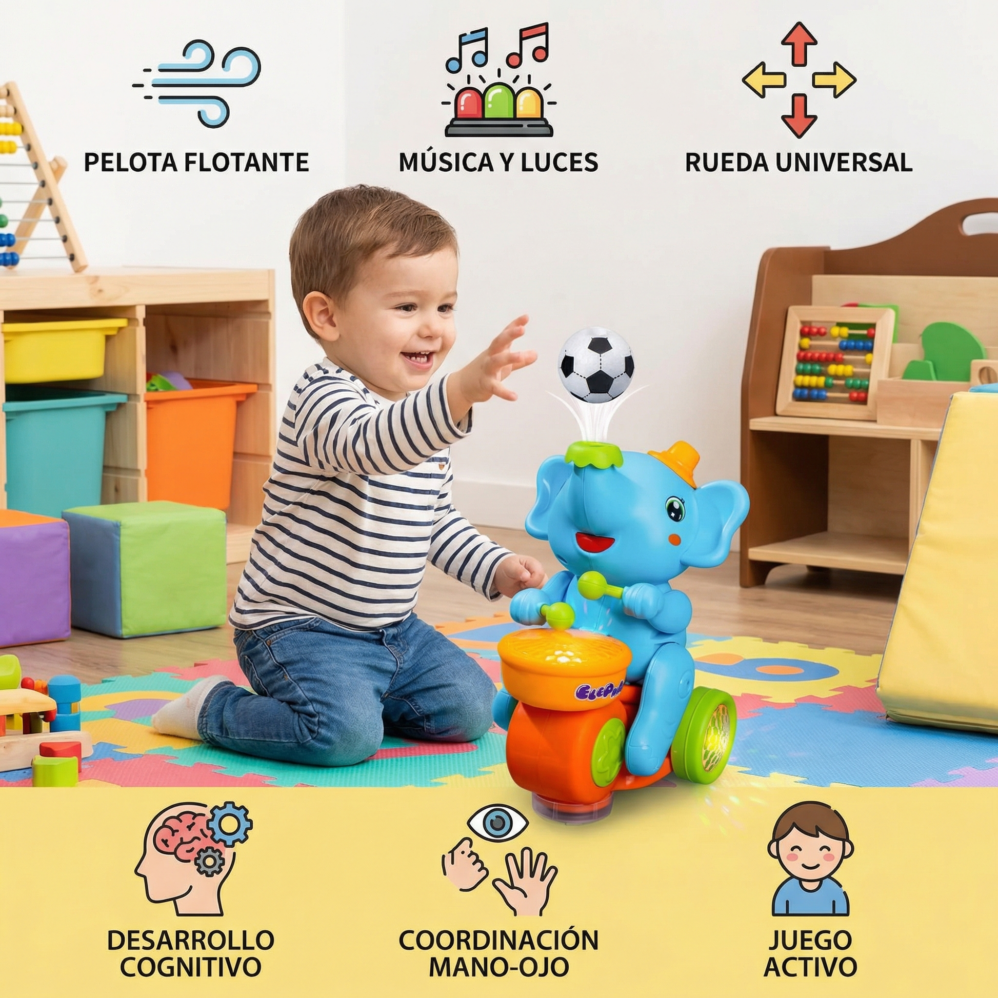 - 🐘 Desarrolla la coordinación y los reflejos: Tu hijo aprende a atrapar y seguir la pelota en movimiento, mejorando la concentración y la precisión.