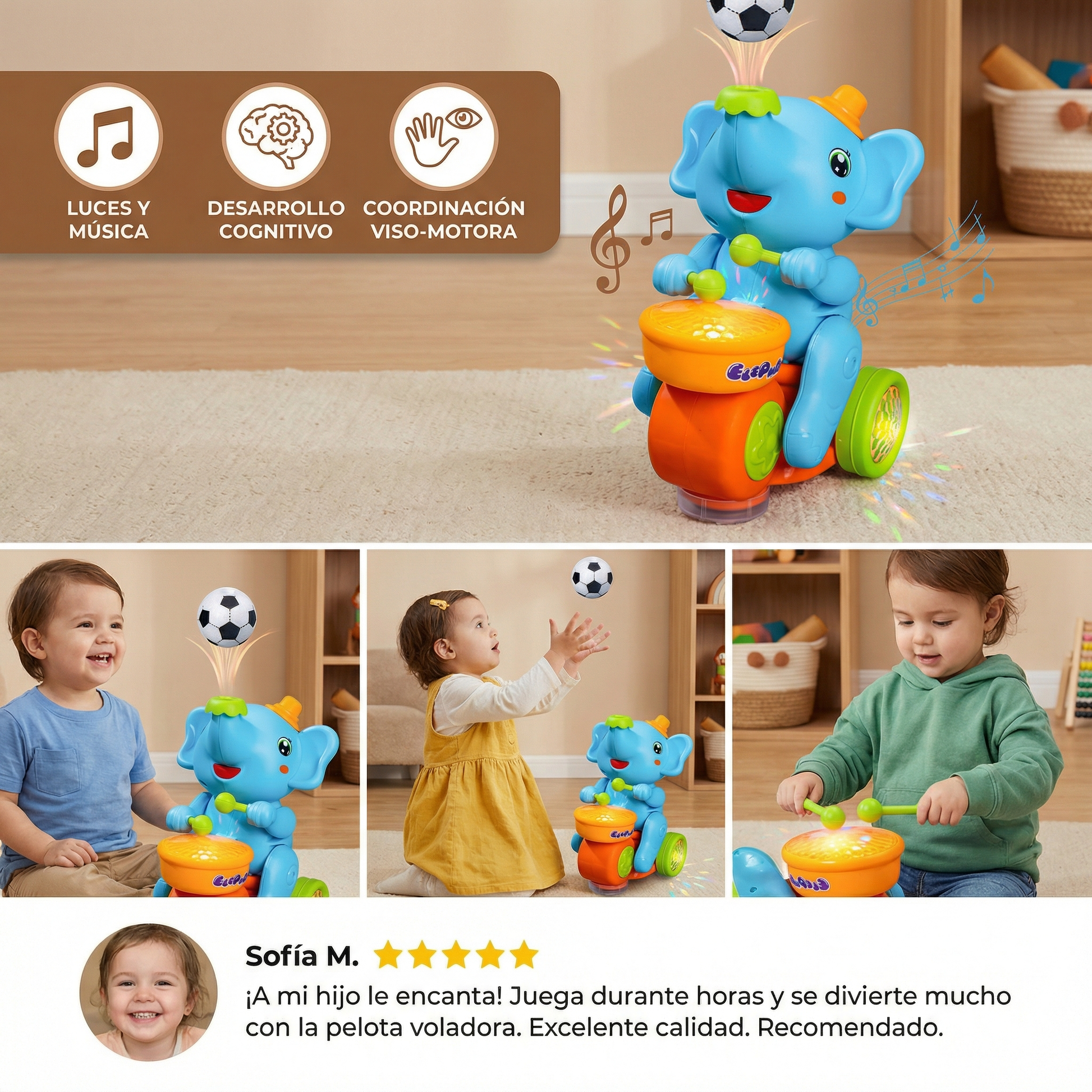 "Mi hijo está fascinado con este elefantito. La pelota flota y se ríe cada vez que intenta atraparla. Es un juguete muy bonito, seguro y perfecto para aprender jugando."