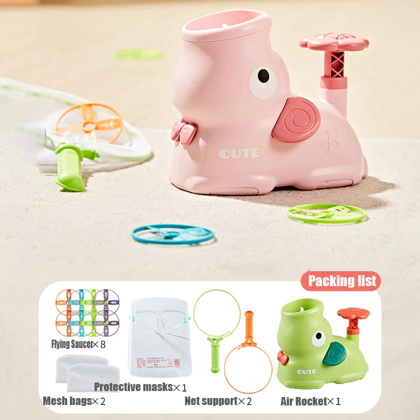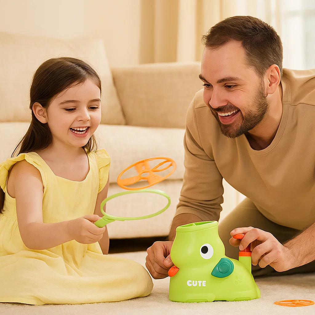 El adorable Lanzador de Discos Voladores con forma de elefante está disponible en rosa y verde, ¡ofreciendo diversión y movimiento sin fin al día de tu hijo! Solo tienes que colocar un disco de color, presionar el botón y ver cómo el alegre elefante lo lanza alto en el aire. Es una forma divertida para que los niños mejoren su coordinación, reflejos y concentración, tanto dentro de casa como en el jardín o de viaje.