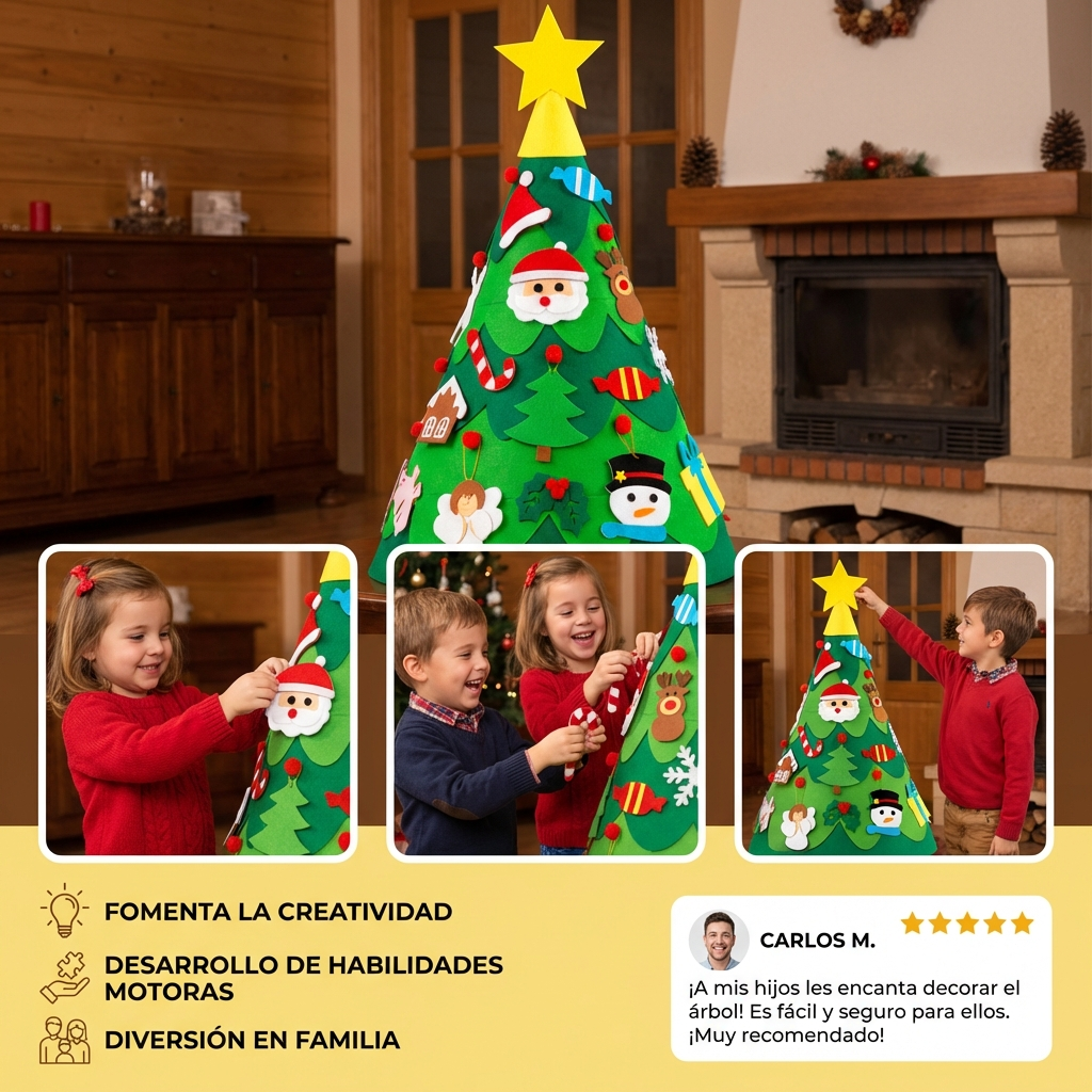 "¡A mi hija le encanta su árbol de fieltro! Cada día inventa nuevas decoraciones y pasa horas jugando. La calidad es excelente y me encanta que sea seguro y se pueda usar cada Navidad."