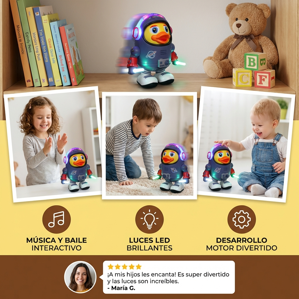 "Compré el Pato Astronauta Bailarín para mi hijo y le encantó desde el primer momento. Le encanta ver cómo se mueve al ritmo de la música y siempre baila con él."