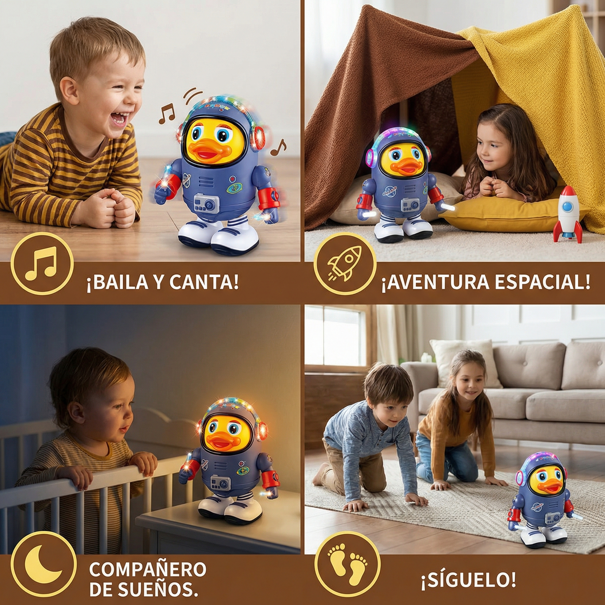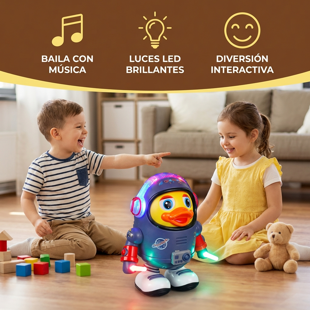 El Pato Astronauta Bailarín no es solo un juguete, sino también una pequeña aventura musical. Los niños aprenden a reconocer el ritmo de la música de manera divertida y se sienten motivados a moverse y bailar.