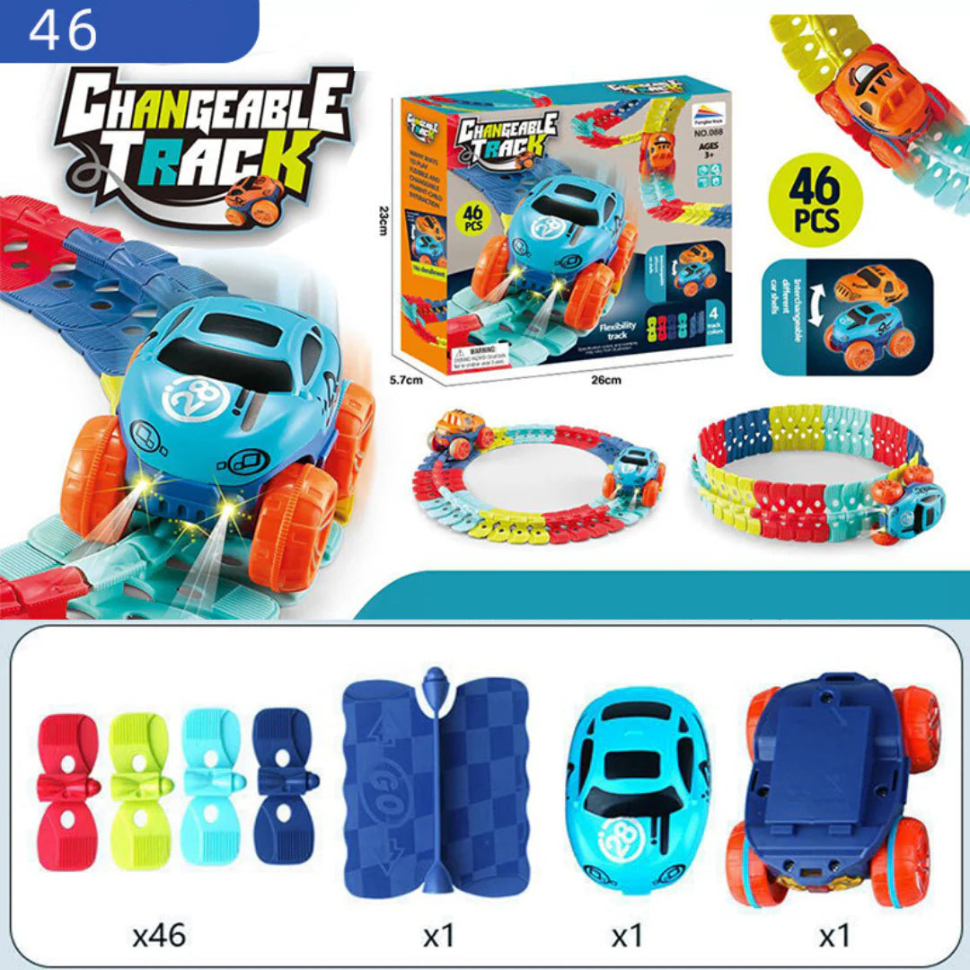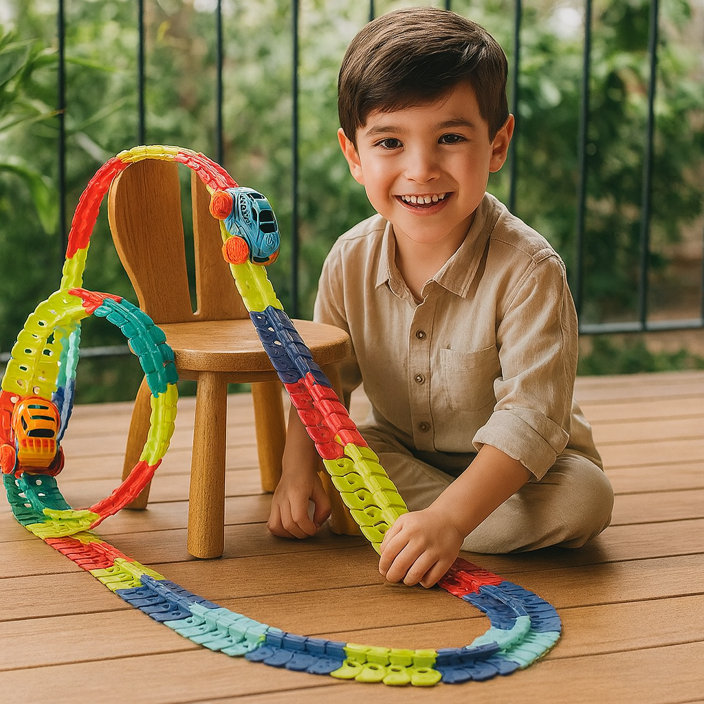 ¡Descubre la magia de la gravedad con nuestra pista de carreras antigravitacional! Los elementos de colores se pueden combinar libremente para crear puentes, bucles y curvas por donde el coche se desliza a una velocidad increíble, ¡incluso boca abajo! Es el juguete ideal para desarrollar la creatividad, el pensamiento lógico y la coordinación motora de tu hijo.