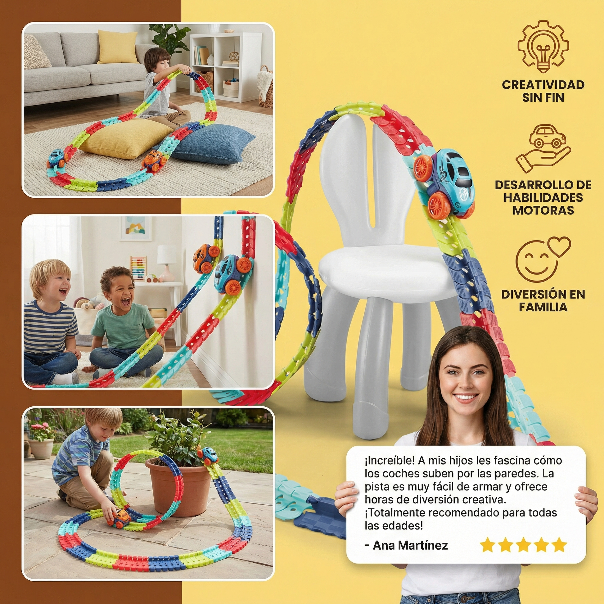 "A mis hijos les encanta esta pista. Pasan horas creando nuevas rutas y jugando. Además, es muy fácil de montar y segura para ellos."