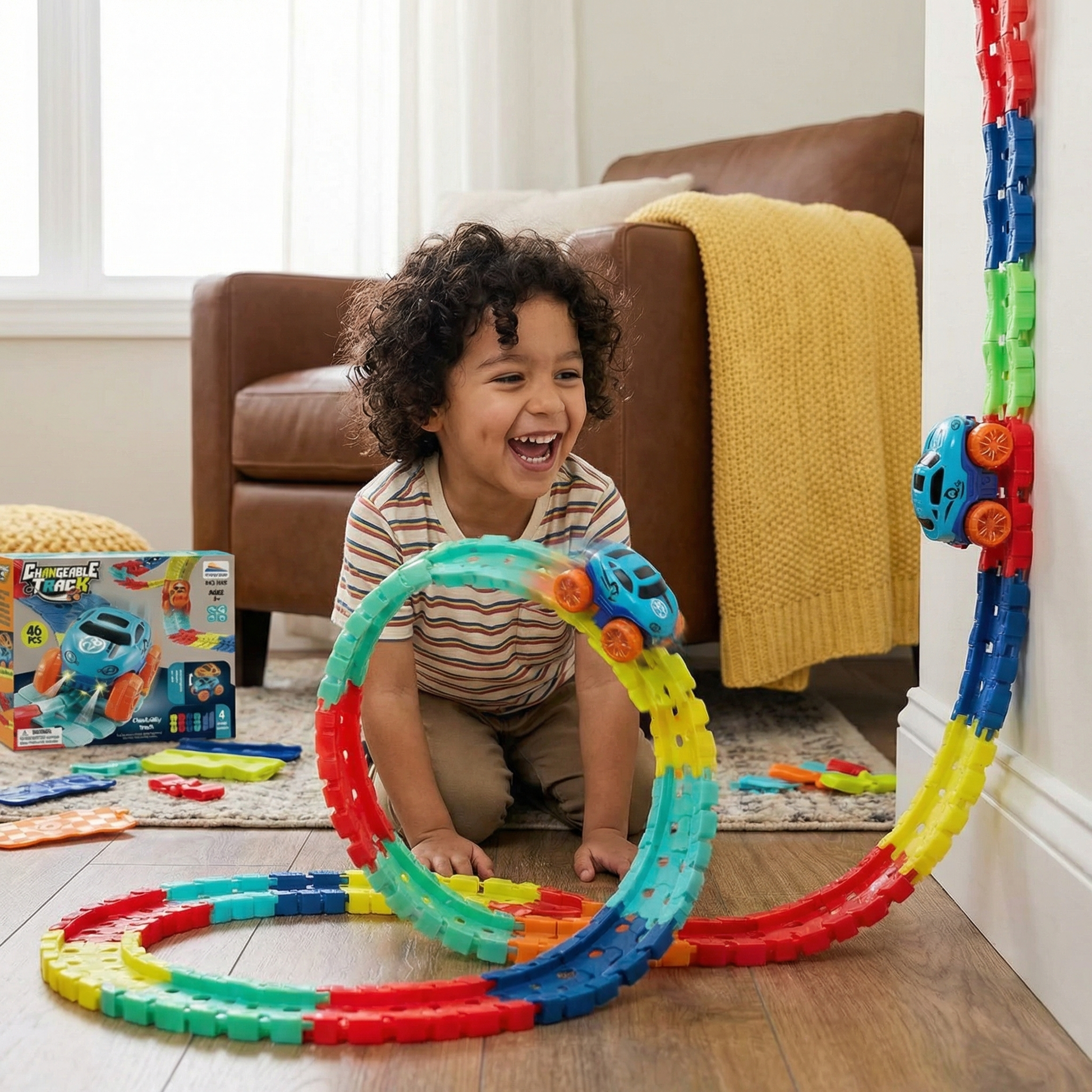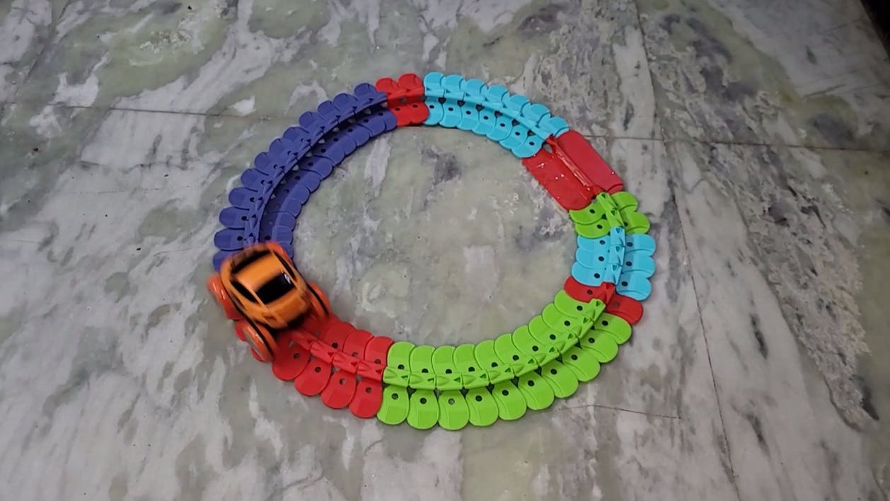 La pista se puede construir de innumerables maneras: vertical, horizontal, sobre la mesa o por las escaleras. El coche puede manejar cualquier pista, dando a los niños la satisfacción de crear y experimentar.
