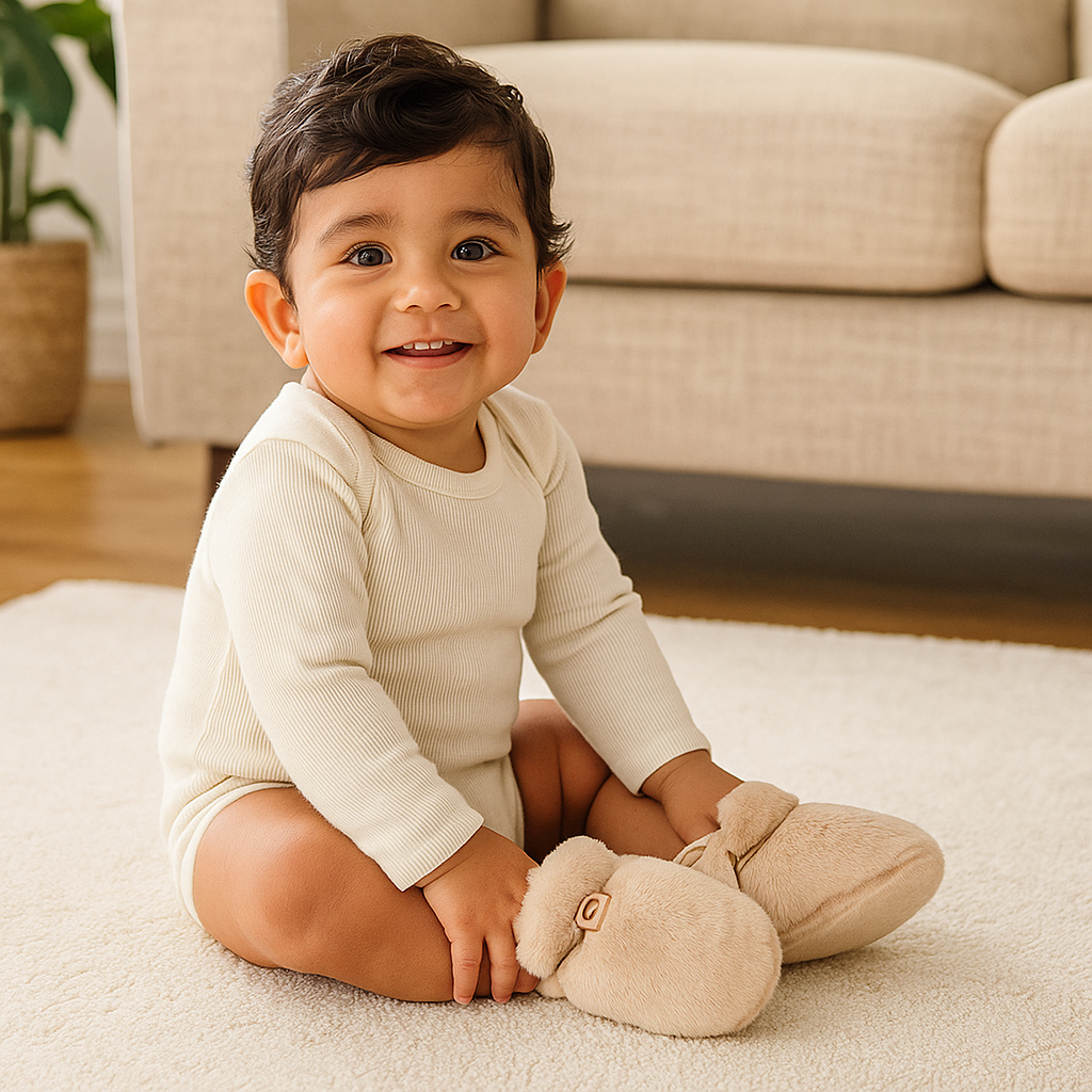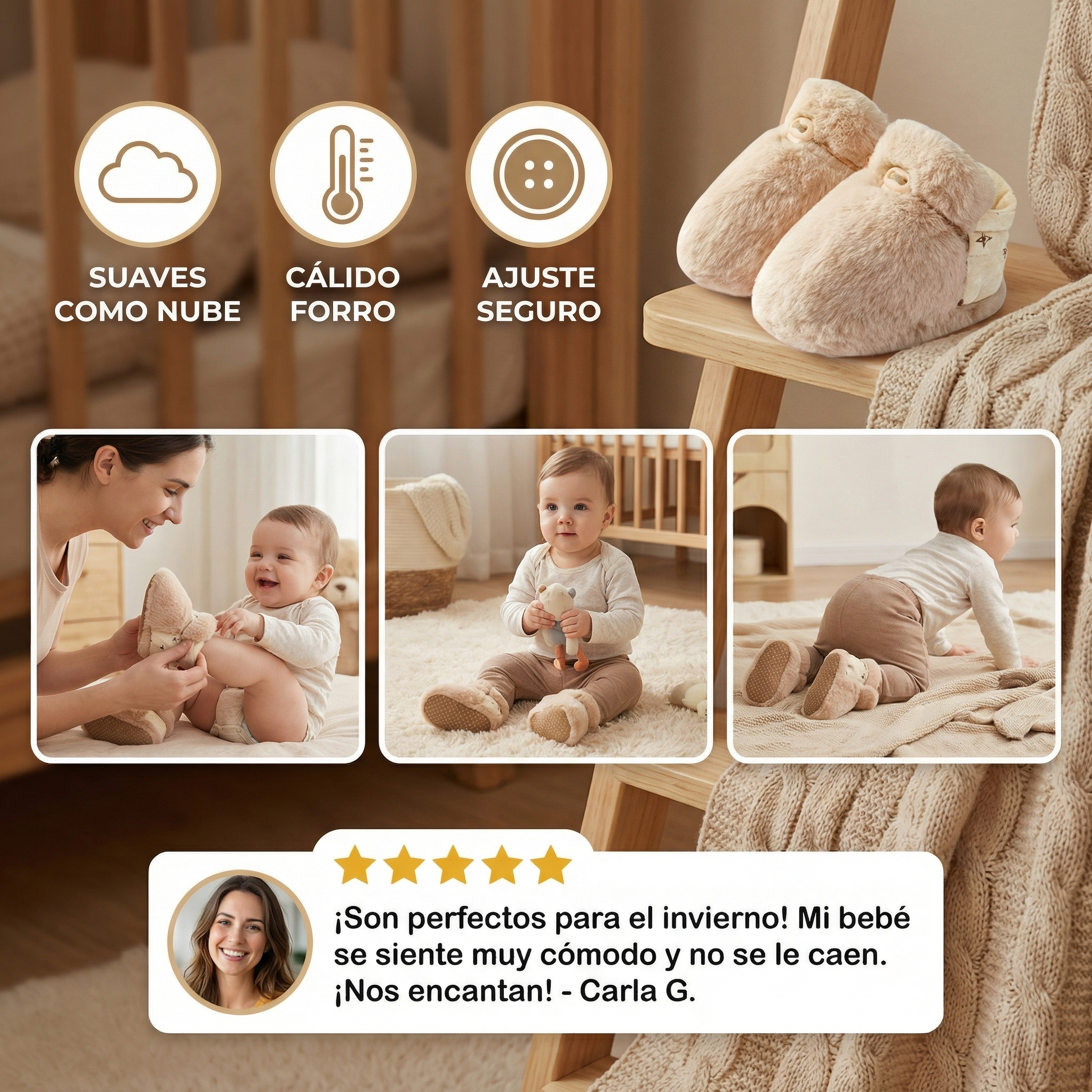 "¡Estas zapatillas son adorables! Mi bebé las usa todo el día y sus pies siempre están calentitos y cómodos. No se resbalan, son súper suaves y se ven preciosas — ¡una compra perfecta!"